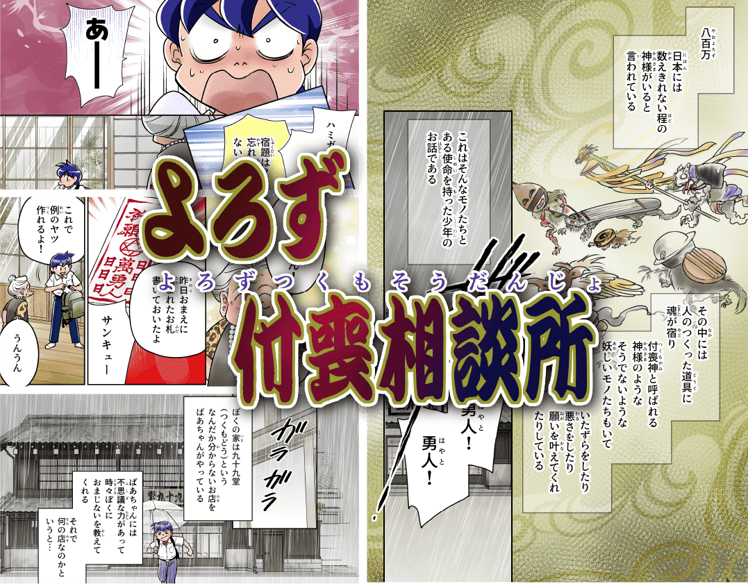 日本には数えきれない神様がいると言われている。その中には人の作った「道具」に魂が宿り「付喪神」と呼ばれるモノたちもいる。萬勇人は「九十九堂」のおばばさまと付喪神様たちの声を聞き、願いを叶えていく。
